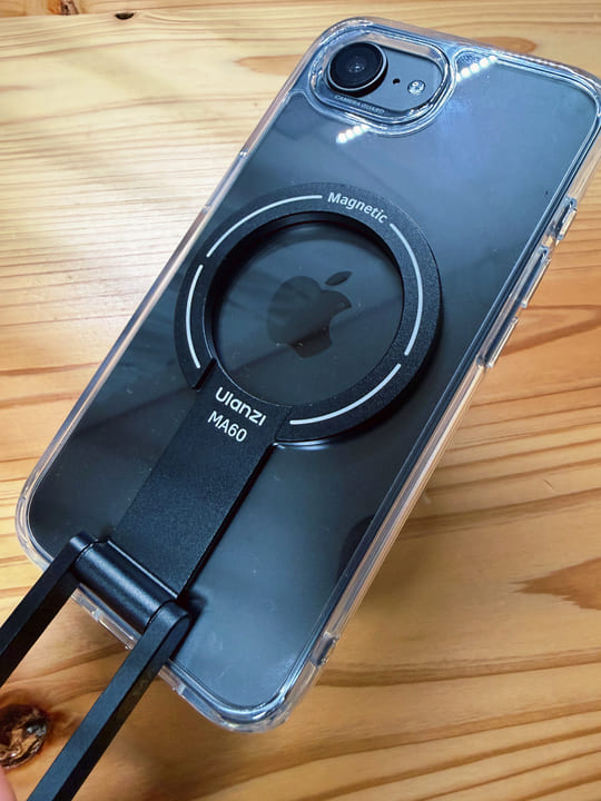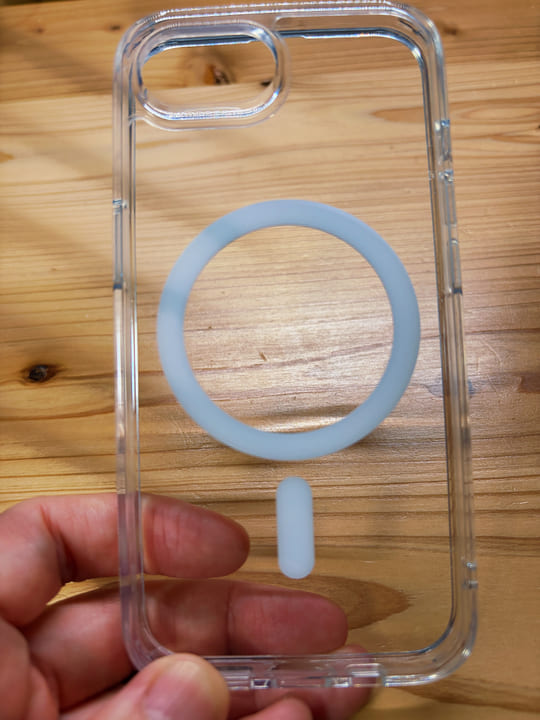 また、MagSafe対応ケースとして背面リングも備えており、手元のMagSafeアクセサリー装着も確認できました。iPhone17eはMagSafe対応モデルなので、ケース互換性だけでなく、こうしたアクセサリー運用まで見ておけると安心です。
